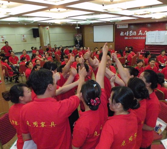三天的培訓北京國富縱橫帶給光明家具的有軍事化早操訓練讓學員們更加嚴謹、更加激情面對每一天的學習。有思想上面的董曉明老師的打造卓越團隊的系列課程、有終端實戰(zhàn)銷售技巧的曹輝老師的《家具賣場成交20大經(jīng)典法則》;王曉文老師的《家具銷售五行連環(huán)掌》。三天的培訓讓光明家具的所有員工緊緊的抱在一起學習到了如何面對未來的家具市場。