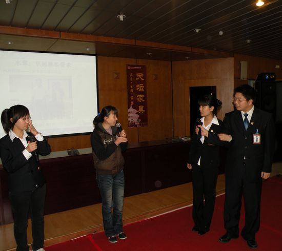 2010年4月1日,天壇家具“金牌店長 王牌導(dǎo)購” 國際•AST第78屆訓(xùn)練營在北京金隅集團(tuán)黨校成功落下帷幕,來自天壇家具市場營銷人員、優(yōu)秀經(jīng)銷商、金牌店長、王牌導(dǎo)購導(dǎo)購員共100多人參加了此次訓(xùn)練營。此次訓(xùn)練營是天壇家具與北京國富縱橫國際•AST商學(xué)院的第二次合作。在專業(yè)次合作成功的基礎(chǔ)上面,國際•AST商學(xué)院的導(dǎo)師根據(jù)學(xué)員們的現(xiàn)場反應(yīng)能力做了更多的更有針對性,更有實(shí)效性的調(diào)整,使此次訓(xùn)練營達(dá)到了更加完美的地步。
